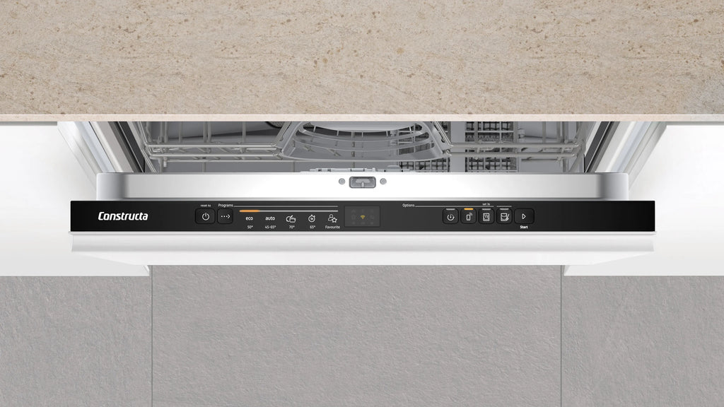 CONSTRUCTA CB5VX03ITE ist ein vollintegrierter 60-cm-Geschirrspüler mit Home Connect, AquaStop und Vario-Korb für flexible Beladung. Das Gerät arbeitet außerordentlich leise und besitzt einen roten Lichtpunkt am Boden zur Betriebsanzeige. Energieeffizienzklasse E (EU-Skala) und geschätzte Einbaumaße: Breite 59,8 cm, Tiefe 55,0 cm, Höhe 82,0 cm (verstellbar). Dosage Assist, stabiler Halt für Kleinteile und die Constructa AquaStop-Garantie reduzieren Wartungsaufwand und Wasserschäden.