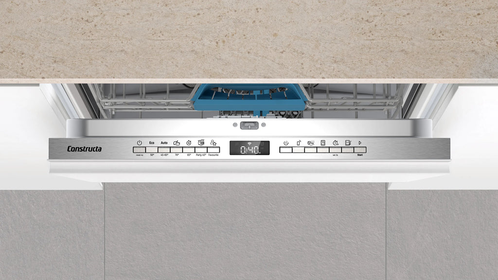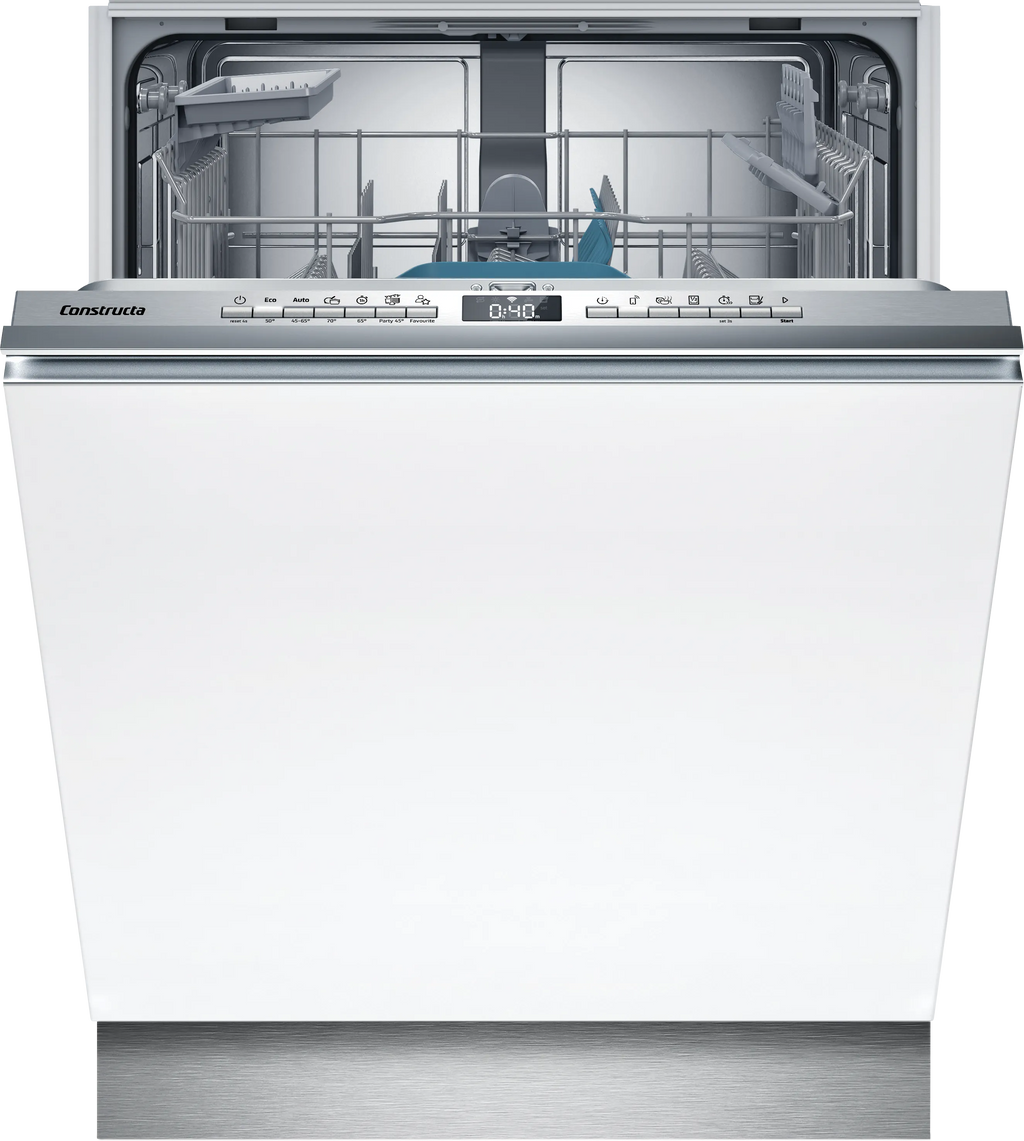 Der CONSTRUCTA CB6HX02HUE ist ein vollintegrierter 60 cm Geschirrspüler (XXL) mit Vario‑Scharnier und Home Connect für flexible Einbaumöglichkeiten und komfortable Vernetzung. Das Gerät bietet ein VarioFlex‑Korbsystem mit zehn umklappbaren Elementen, DosageAssist zur kontrollierten Auflösung von Spültabs und AquaStop zum Schutz vor Wasserschäden. Betriebsgeräusch ca. 42 dB(A) und Wasserverbrauch im Eco‑Programm ~9,5 L/Zyklus; Einbaumaße ca. B 59,8 × H 82–87 × T 55 cm. Energieeffizienzklasse D (Skala A–G) und Programme wie Eco 50 °C sowie Party 45 min gewährleisten effiziente, schnelle und schonende Reinigung.