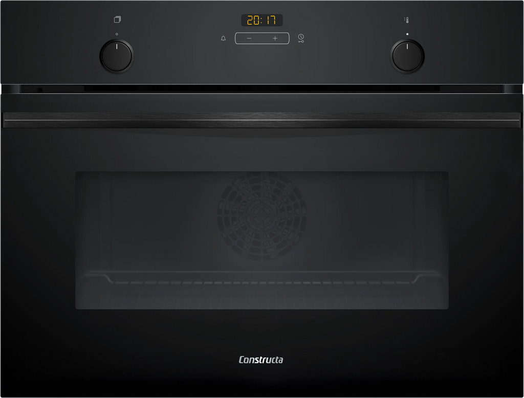 Der CONSTRUCTA CC4M61063 Einbau-Kompaktbackofen bietet präzise Heißluftprogramme kombiniert mit HydroClean-Dampfunterstützung für einfache, umweltschonende Reinigung. Gerätemaße ca. 45 x 59,5 x 55 cm (H x B x T) und Energieklasse A sorgen für platzsparende Einbaulösungen bei niedrigem Energieverbrauch. Die fugenlose Vollglas-Tür, das rote LED-Display mit Drehknebel sowie Home Connect/WiFi und Schnellvorheizfunktion erhöhen Bedienkomfort und Effizienz. Lieferumfang: großflächige Universalpfanne und glanzverchromter Bratrost; programmierbare Startvorwahl ermöglicht zeitgesteuertes Backen.