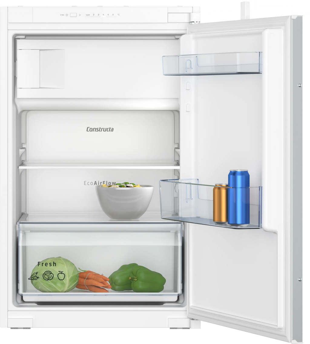 Der CONSTRUCTA CK222NSE0 Einbau-Kühlschrank (H x B x T: 87,4 x 54,1 x 54,5 cm) bietet effiziente Kühlung mit integriertem Gefrierfach und langlebiger LED-Innenbeleuchtung. Die Energieeffizienzklasse E (EU-Label) und das EcoAirFlow-System sorgen für gleichmäßige Temperaturverteilung und optimierten Energieeinsatz. Intelligente Innenraumgestaltung, LED-Touch-Display und Warnsignal bei Fehlfunktionen erhöhen Bedienkomfort und Lagerflexibilität für Lebensmittel. Schmaler Einbau mit Schleppscharnier ermöglicht einfache Montage in Standard-Küchenschränken und maximiert verfügbaren Stauraum.