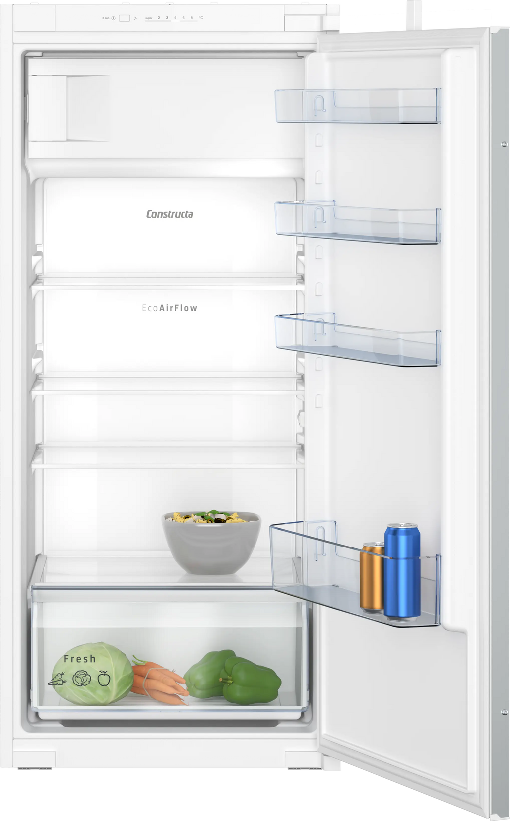 Das EcoAirFlow-System sorgt für gleichmäßige Luftzirkulation im gesamten Innenraum und erhält die Frische von Lebensmitteln. Langlebige LED-Innenbeleuchtung und ein weißes LED-Touch-Display ermöglichen präzise Steuerung und beste Sichtverhältnisse. Abmessungen (H x B): 122,1 x 54,1 cm; Energieeffizienzklasse: E (EU-Label). Intelligente Innenraumgestaltung bietet flexible Ablagen und zusätzlichen Platz für Obst und Gemüse.