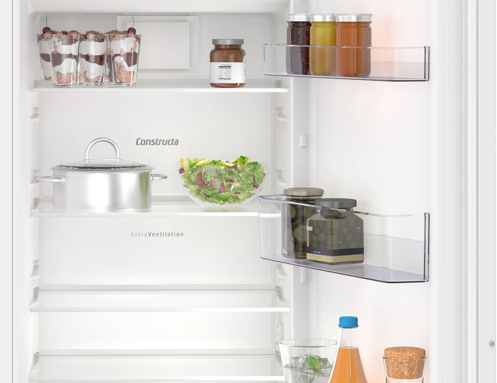 Der CONSTRUCTA CK282NSE0 ist ein Einbau-Kühlschrank (H x B x T: 177,2 x 54,1 x 54,0 cm) mit integriertem Gefrierfach und effizienter LED-Innenbeleuchtung. Energieeffizienzklasse E (Skala A–G) kombiniert mit intelligenter Innenraumaufteilung, XXL-Frischlade und SuperKühlen-Funktion für schnelles Herunterkühlen neu eingefüllter Lebensmittel. Umfangreiche Lagerflexibilität durch verstellbare Glasböden, Türablagen und großzügige Obst-/Gemüseschubladen. Hergestellt in Deutschland; das Gerät bietet leisen Betrieb und praxisnahe Funktionen für den täglichen Haushalt.