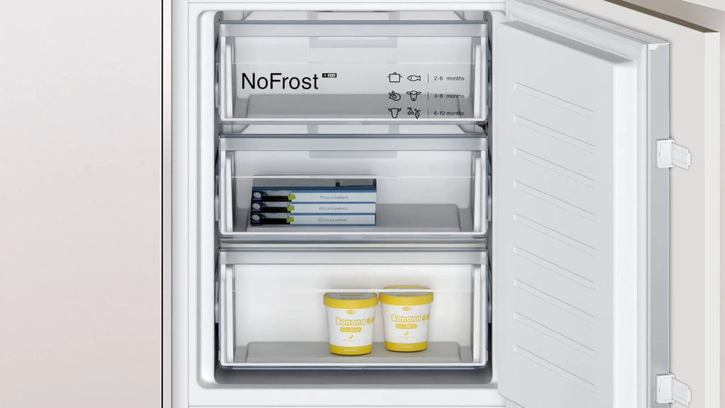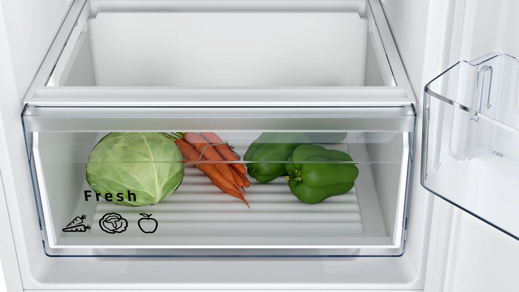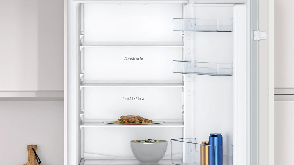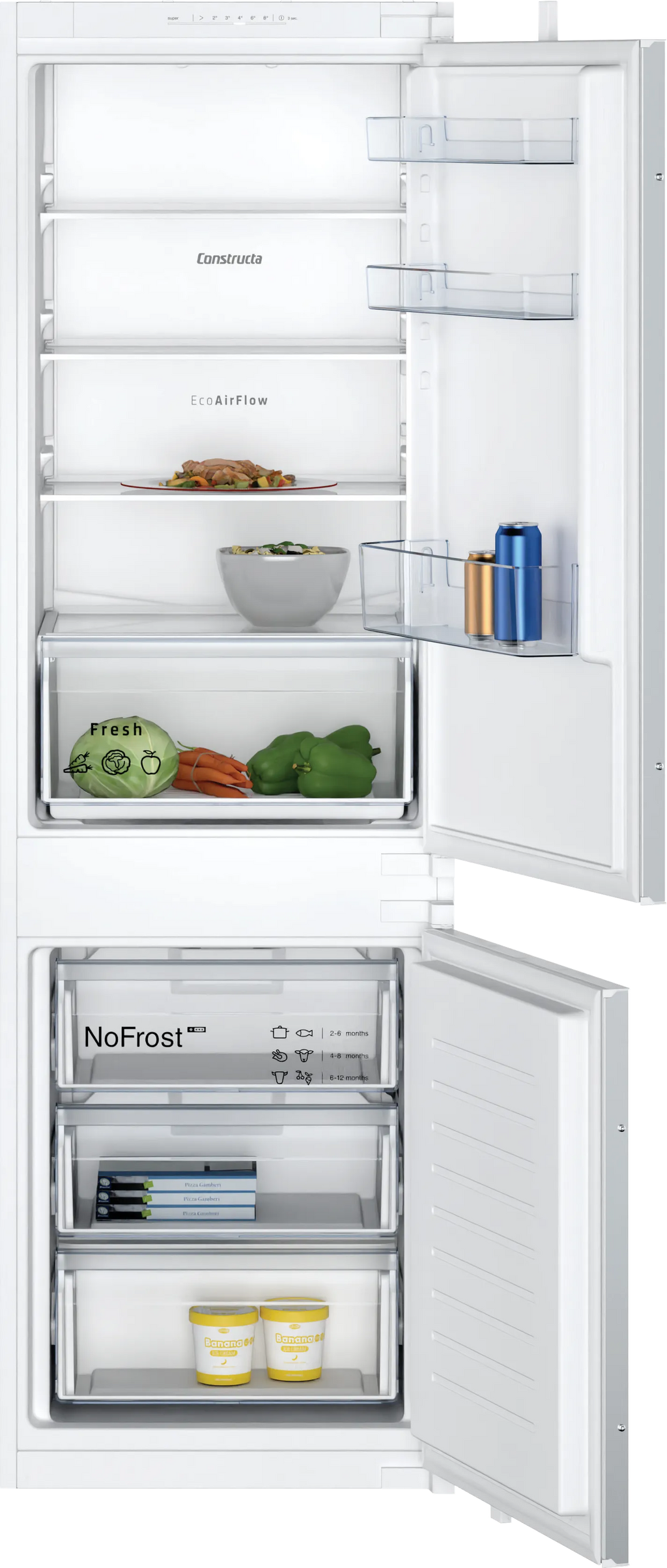 CONSTRUCTA CK786NSE0 ist eine platzsparende, vollintegrierbare Kühl-Gefrier-Kombination mit Gefrierbereich unten und spezieller Fresh‑Schublade für längere Frische von Obst und Gemüse. Die Geräteabmessungen betragen ca. 177,2 × 54,0 × 54,5 cm (H × B × T) bei einem Gewicht von etwa 63 kg; Energieeffizienzklasse E (EU) gewährleistet standardisierte Verbrauchswerte. Variable Glasablagen, transparente Gefrierladen und durchdachte Türfächer optimieren Übersichtlichkeit und Lagerkapazität. Hergestellt in Deutschland, ausgelegt für einfache Integration in Einbauküchen und zuverlässigen Alltagsbetrieb.