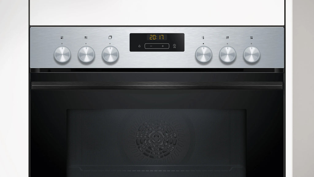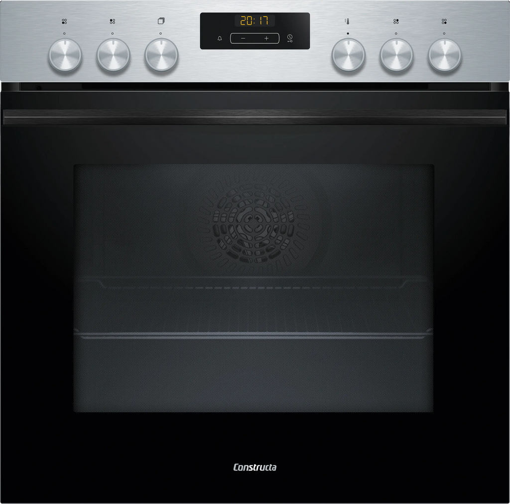 CONSTRUCTA CX5HS610 Einbau‑Herd‑Set kombiniert den Backofen CH3M51053 mit dem Cerankochfeld CM323052 für vielseitiges Kochen und Backen. Der Backofen bietet Energieeffizienzklasse A+ (EU‑Spektrum A+++ bis D) sowie HydroClean‑Dampfreinigung, fugenlose Vollglas‑Tür, Schnellvorheizen (Fast Pre‑Heat) und ein rotes LED‑Display mit Drehknebeln. Abmessungen Gerät: H 59,5 cm × B 59,5 cm × T 56,5 cm; Gewicht ca. 36 kg (geschätzt). Enthaltenes Zubehör: großflächige Universalpfanne und glanzverchromter Bratrost; Anschluss als Festanschluss, Home Connect‑Hinweise laut Hersteller.